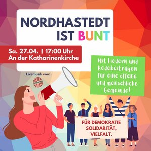 Kundgebung für Demokratie, Solidarität und Vielfalt gegen Rassismus, Hass und Rechtsextremismus in Nordhastedt am 27. April um 17.00 Uhr, Treffpunkt an der Katharinenkirche Kommt zahlreich.